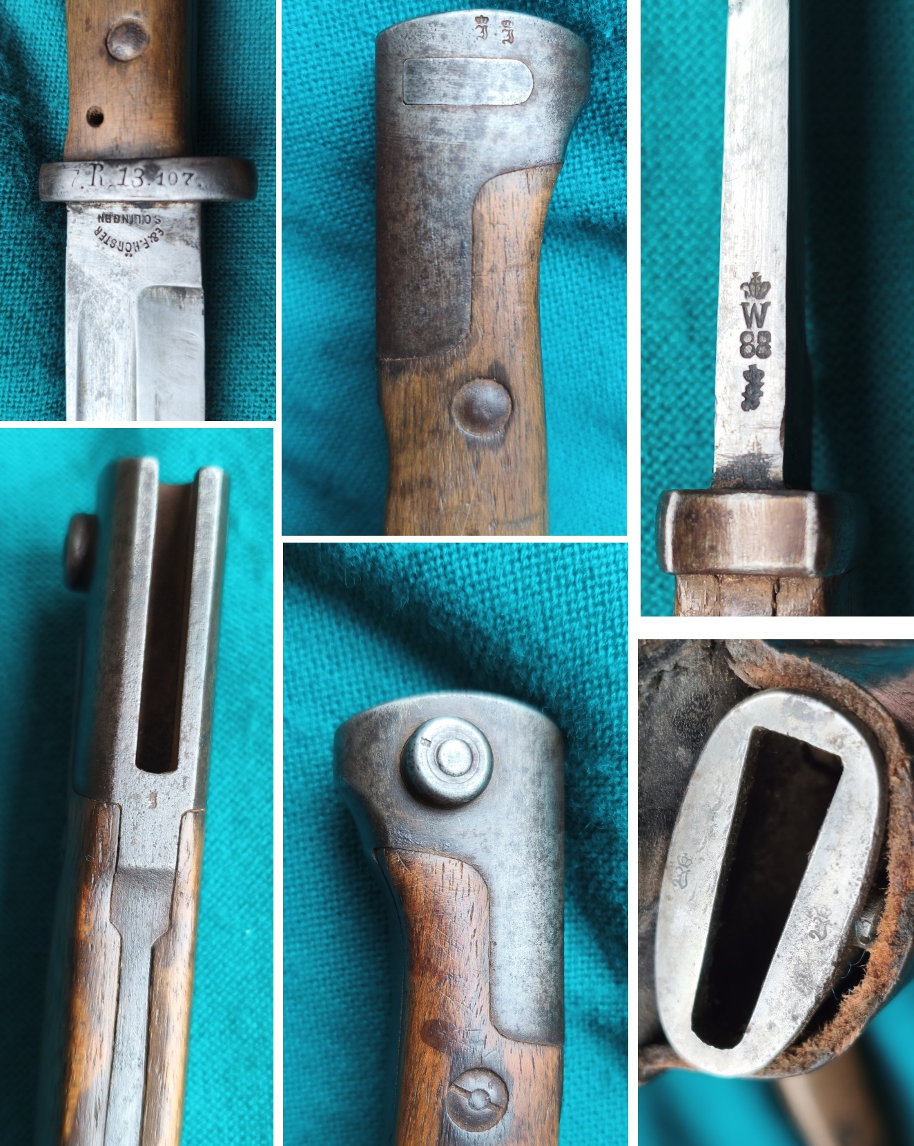 Kräftige Rückenklinge, seitlich Hersteller Hörster Solingen. Rücken mit Abnahmestempel W unter Krone sowie 88 usw. Parierelement mit Regimentsbezeichnung. Drücker intakt. Über Drücker, auf Drücker sowie Rücken mit Abnahmestempel. Lederscheide mit eisernen Beschlägen. Originaler Koppelschuh. Gesamtlänge mit Scheide 42cm.