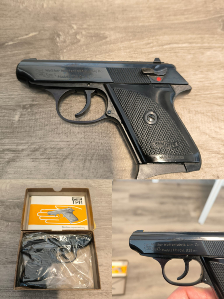Walther TPH Pistole im Kaliber 6,35 mm, Baujahr 1971, Seriennummer 258500. Die Waffe befindet sich in gutem, gepflegten Zustand. Originalverpackung ist vorhanden, ein zusätzliches Magazin ist nicht enthalten, siehe Bilder. Die Walther TPH ist eine kompakte Selbstladepistole mit hochwertiger Verarbeitung und eignet sich sowohl für Sammler als auch für Sportschützen. Abgabe ausschließlich an Erwerbsberechtigte unter Einhaltung der gesetzlichen Bestimmungen. Versandkosten: Porto bis 150 Euro versichert 29,99 €, Porto bis 500 Euro versichert 39,99 €. Privatverkauf, keine Garantie oder Rücknahme.