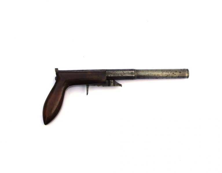 Handliche Boot-Pistol, 22,5 cm lang, Kaliber 8mm. Die Namens-Gravur auf dem Lauf, "M. S. HALE", kann ich nicht zuordnen. Bei aller Einfachheit der Konstruktion ist die Waffe sorgfältig gefertigt. Das Kimmen-Blatt aus Messing ist sauber in die Aufnahme eingesetzt; der Abzugsweg lässt sich mittels Stellschraube regulieren. Daher würde man eher an eine Scheibenpistole denken, wie sie in dieser Bauweise noch als Replik gefertigt wird. Für eine Scheibenpistole spricht auch die fehlende Laderast; der Hahn lässt sich nur in Spannrast arretieren.