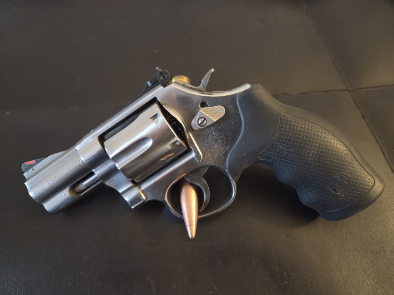 Sehr wenig gebrauchter S&W Revolver Kal.: .357Mag. in Edelstahl. Lauflänge 2,5", 6 Schüssig, alle Elemente lassen sich leicht bedienen, Trommel und Lauf Spegelblank.