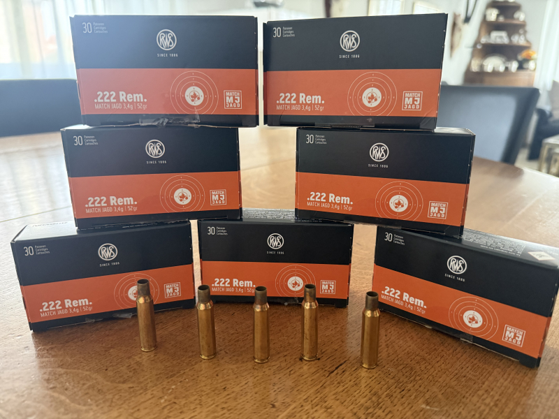 Verkaufe 200 Stück abgeschossene RWS-Hülsen im Kaliber 222 Remington in Original-Verpackung.