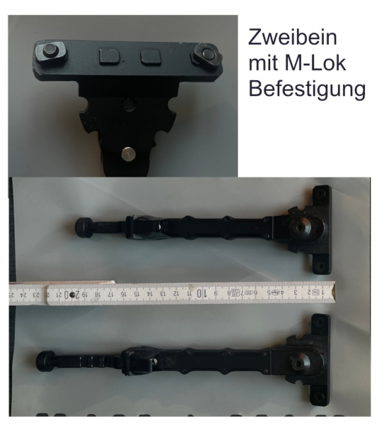 Verkaufe Zweibein mit M-Lockbefestigung. Das Zweibein eignet sich zur Befestigung an den klassischen Schäften mit den Langlochbohrungen, das Zweibein lässt sich 3 fach ausziehen jeweil ca um einen Centimeter Unterschied. Höhe ca 19 bis 23 Cm(siehe Foto)