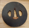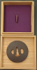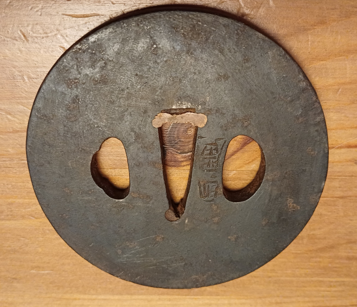 Tsuba aus Eisen für ein japanisches Katana, schöne und interessante Signierung. Mit deutlichen Montagespuren und Altersspuren, teilweise rostig bzw. rostnarbig. Durchmesser 7,5 cm. Mit gepolsterter Holzbox.