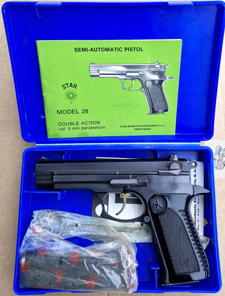 Sie bieten auf eine halbautomatische Pistole von Star, Modell 28 im Kaliber 9mmLuger. Die Waffe stammt aus einem Jägernachlass und wurde nur sehr wenig geschossen. Entsprechen gut ist der Zustand, die Funktionen sind einwandfrei. Die Star Pistole gehört zu den in den 80er Jahren entstandenen "Wondernine" mit doppelreihigen Magazin. Das Star Modell 28 nahm somit auch in den 80er Jahren an der Ausschreibung der US-Armee für eine neue Dienstpistole mit teil. Die Ganzstahlwaffe ist u.a. für das Dienstpistolen Schiessen zugelassen. Die Waffe wird in der original blauen Schachtel geliefert, Bedienungsanleitung und Putzstock liegen bei, ebenso ein noch völlig unbenutzes Reservemagazin. Daher auch für Sammler interessant. EWB erforderlich, internationaler Versand nur über einen zu benennenden deutschen Händler.