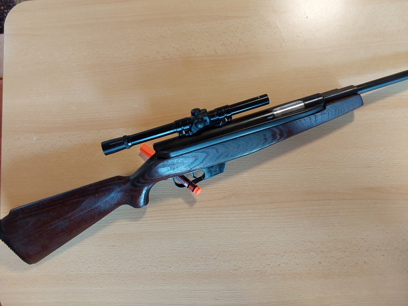 Verkaufe einen Seitenspanner von Umarex 4,5 mm sehr starkes Luftgewehr, Schaft wurde überarbeitet. Gehäuse wurde vom Rost befreit und neu brüniert. Inklusive Zielfernrohr (Anschütz 4x), da Kimme und Korn fehlen. Ist mit original Feder und kommt damit auf 10 Joule, getestet mit 0,52 g Diabolos, siehe Bilder auf dem Crony.