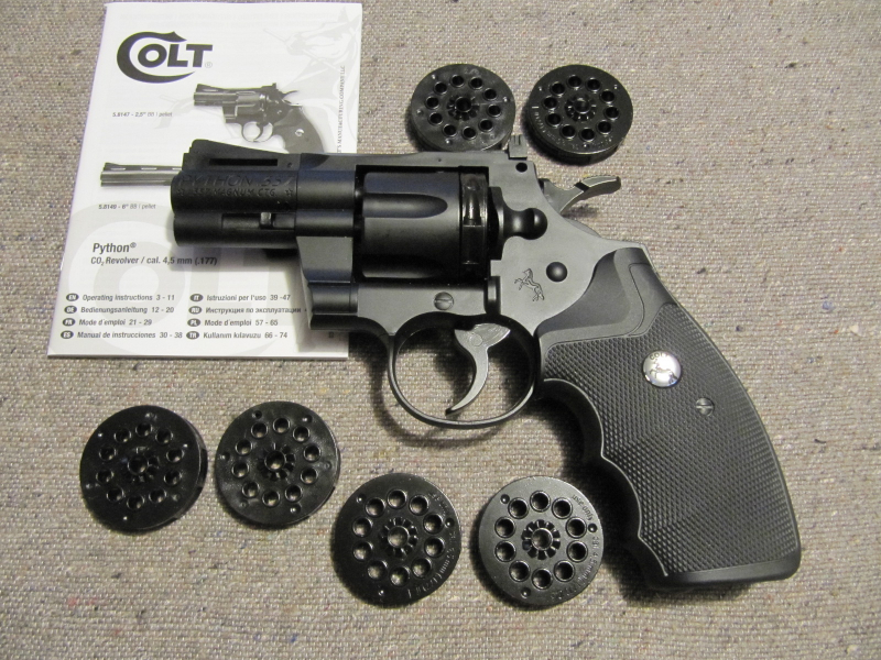 Der Revolver wurde kaum geschossen (ca. 400 Schuss). Ist neuwertig. War mehr ein Sammelobjekt. Der Revolver hat einen 2,5 Zoll langen, gezogenen Stahllauf. Er ist größtenteils aus hochwertigem Kunststoff gefertigt. Dadurch ist er relativ leicht – ca. 500g. Er ist ordentlich verarbeitet – die Passungen sind eng, nichts hat Spiel oder klappert. Hersteller ist Umarex. Zum Laden wird eine Verriegelung geöffnet und das Trommelmagazin herausgenommen. Das Magazin fasst 10 Diabolos. Großes Plus - der Revolver kommt mit insgesamt 7 Magazinen. Vier Stück davon aus Metall und 3 aus Kunststoff. In der Funktion gibt es keinen Unterschied – es funktionieren beide Materialien gleich gut. Laut Beschreibung gehen auch Stahl BBs. Habe ich aber nicht probiert, um den gezogenen Lauf zu schonen. Nach Einlegen des Magazins kann es losgehen. Es ist ein Double-Action-Revolver, daher, wenn man den Hahn vorspannt, hat man einen sehr angenehmen und leichtgängigen Abzug. Durch das große, ergonomische Griffstück liegt der Revolver sehr gut in der Hand. Die Kimme lässt sich in Höhe und Seite verstellen. Das Einlegen der CO2 Kapsel geht sehr einfach. Die linke Griffschale abnehmen, Kapsel einlegen und die Schraube mittels dem Sechskant an der Griffschale eindrehen. Es sind 80 Schüsse möglich. Durch den kurzen Lauf ist er auf größere Entfernungen natürlich kein Präzisionsgerät. Auf Distanzen von 5 bis 8 Meter bekommt man aber gute Ergebnisse auf die Scheibe. Da er leicht und handlich ist, macht er besonders Spaß beim Action-Schießen auf Dosen etc. Ein schöner, klassischer Revolver der auch ordentlich Power hat. Kommt mit Anleitung im Original-Karton. Versand versichert als DHL-Paket.
