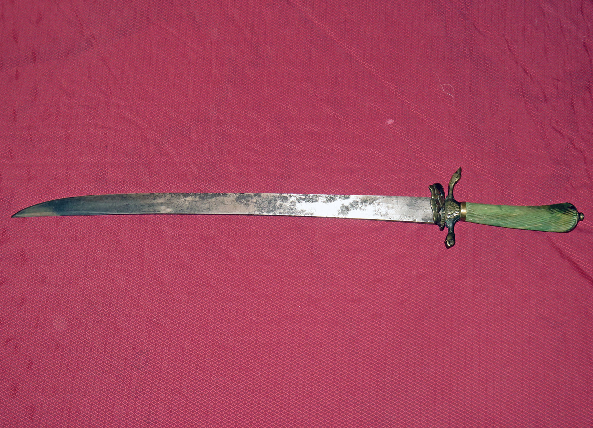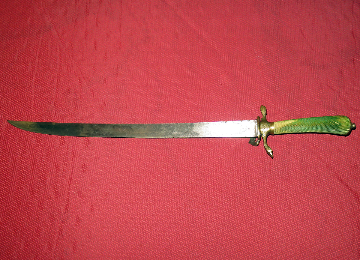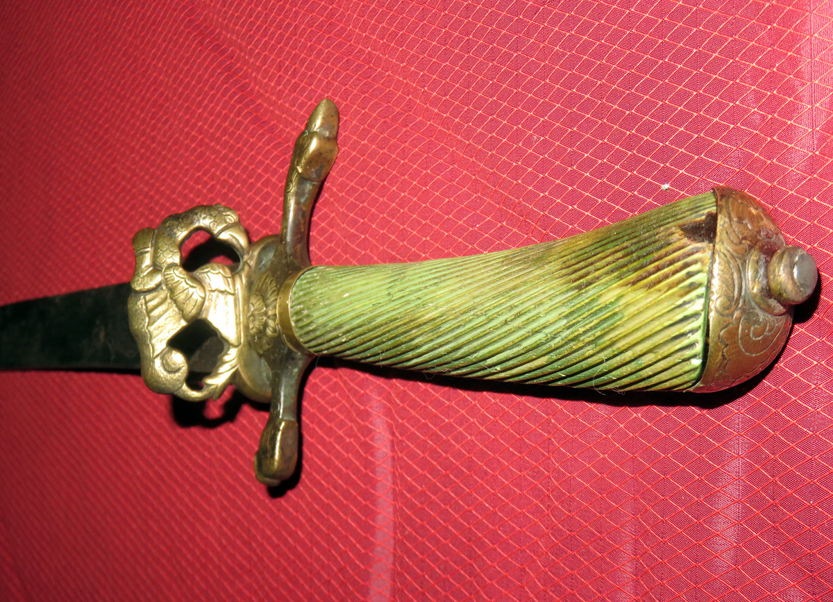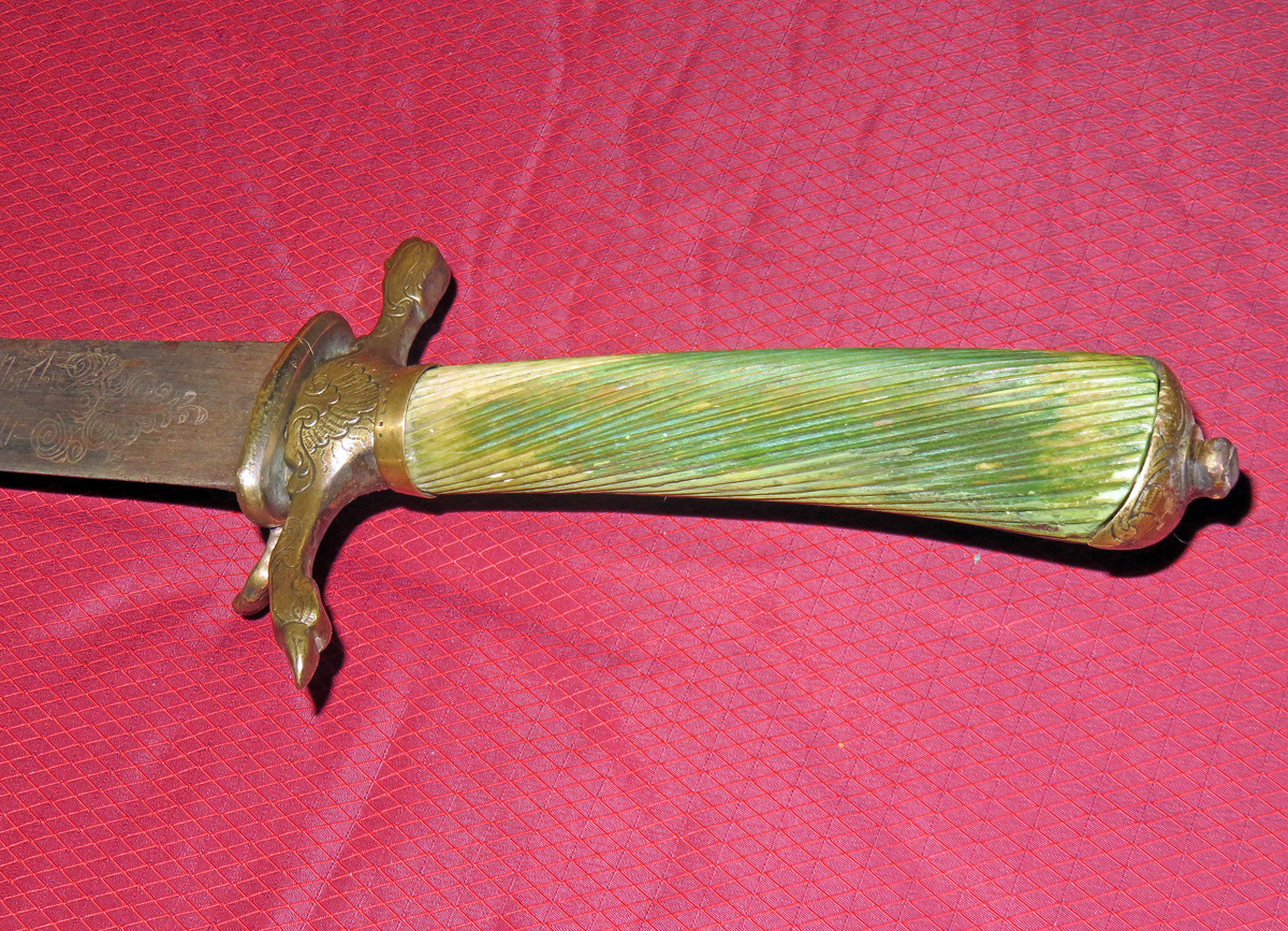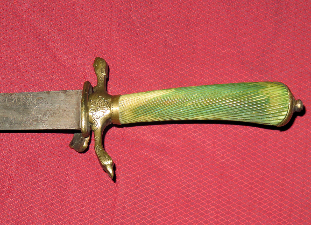 Alte Jagdplaute/Hirschfänger mit einer Messingmontierung, leicht gekrümmter schmaler Rückenklinge und gerilltem grünlichen Beingriff.