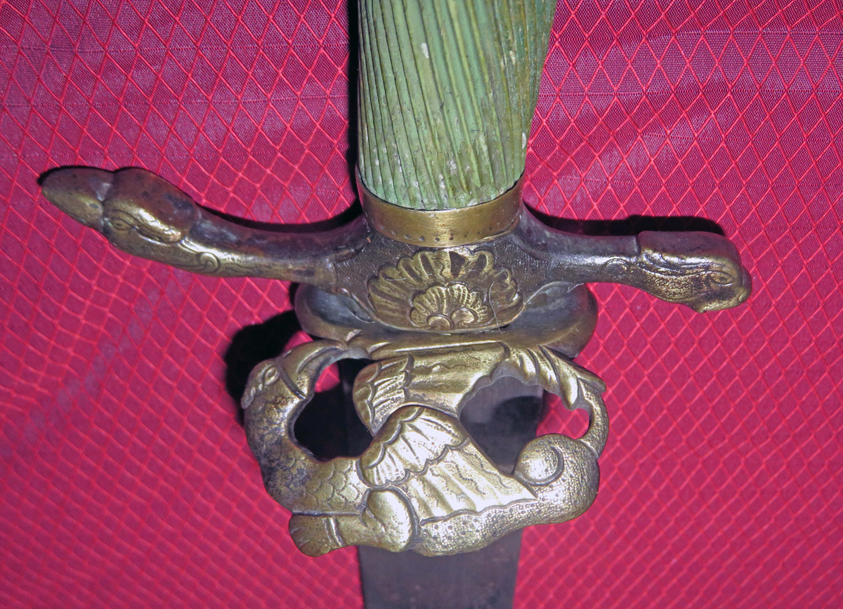 Das Stichblatt hat ein schönes Vogel-Adlermotiv, die Parierstange ist in geschwungener Form von Vogelköpfen.