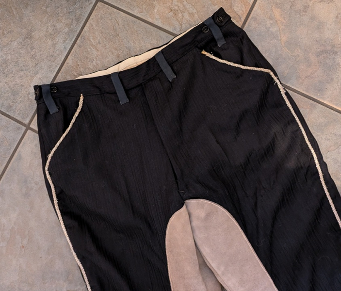 verkaufe: eine Old Time Hose im "SouthWest Style" TexMex - Größe ca. 50 bzw. Jeansgröße 34 (Bundweite ca. 90 cm und Gesamtlänge ca. 102 cm) - hab ich vor Jahren aus einer klassischen Stresemannhose von einer Schneiderin umarbeiten lassen da es TexMex Kleidung kaum "von der Stange" zu kaufen gibt - die Taschen und Seitennähte der Hose wurden mit Applikationen in Form von Borte/Kordel versehen, das Gesäß und die Innenseiten der Hose wurden mit Rauleder verstärkt - leider bin ich der Hose etwas "entwachsen" - guter gebrauchter Zustand mit Tragespuren (Siehe Fotos!), voll trag-und verwendbar, ein schönes Teil fürs Westernhobby