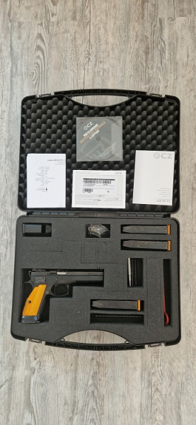 Für das sportliche Schießen optimierte Ganzstahl-Selbstladepistole mit langem Dustcover, speziell abgestimmtem Direkt-Abzug (SA only; mit Triggerstop), von Hand angepasstem, polierten Lauf sowie von Hand eingepasstem Verschluss.