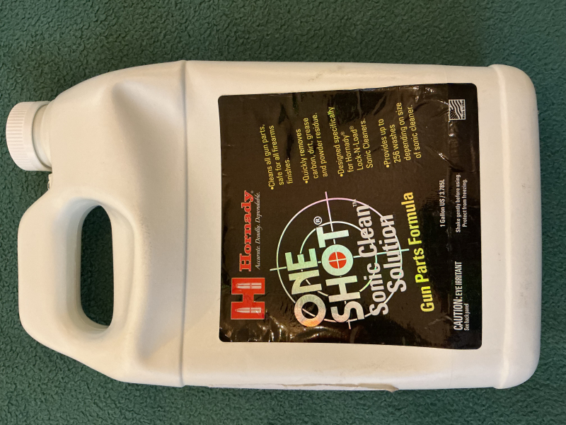 Hornady, One Shot, Sonic Clean Solution zum reinigen von Waffenteilen und Hülsen. Original verschlossen. 1Gallone / 3,785 L wird im Verhältnis von 40 zu 1 mit Dest.Wasser verdünnt, bis zu 256 Reinigungen in Abhängigkeit von der Größe des Ultraschall Gerätes. UVP ca 114€ wenn überhaupt noch erhältlich. Privatverkauf, keine Rückgabe od Garantie, ausschließlich innerdeutscher Versand als versichertes Paket mit DHL bis 5 kg für 7,69 oder Hermes für 6,99.