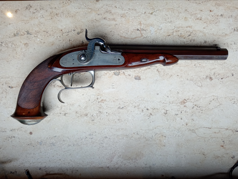 Biete eine gebrauchte VL-Pistole von Davide Pedersoli im Kaliber .31 an. Über das genaue Alter kann ich keine Angabe machen, gehe davon aus , daß die Pistole über 20 Jahre alt ist. Die Pistole hat Gebrauchsspuren, kleine Dellen auf beiden Seiten am Laufhaltekeil, etwas Flugrost an der Griffkappe. Der Lauf ist bräuniert, die Kimme in der Höhe verstellbar, der Lauf hat keinen Rost. Mit dabei ist der Koffer ( Schaumstoffeinlage wurde ersetzt), einige RK .308", .305" , Schußpflaster in verschiedenen Stärken.