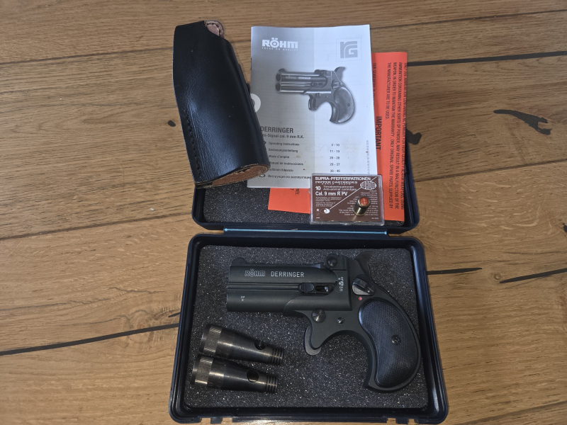 Verkaufe aus meiner Sammlung, ein Set mit einem neuwertigen Röhm Twinny Derringer brüniert im Kaliber 9mm R.K. PTB 599, mit minimalen Gebrauchs-/Lagerspuren, einem unbenutzten Echtleder Holster, 10 extra starke 9mm R PV Wadi Supra-Pfefferpatronen (abgelaufen daher o. Gewähr), zwei unbenutzte Abschussbecher, allen Anleitungen und OVP.