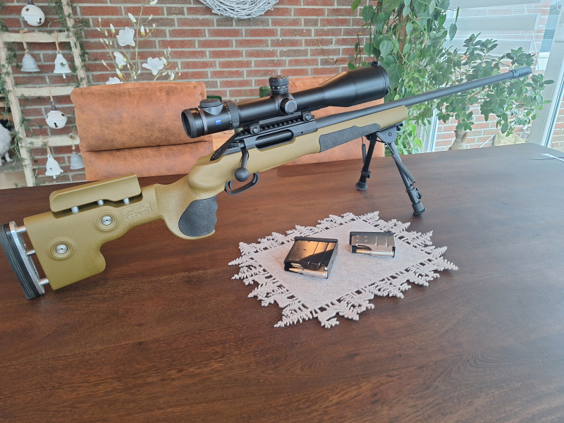 Auf der Waffe ist ein Zeiss Victory V8 4,8–35×60 montiert, eines der leistungsstärksten Zielfernrohre seiner Klasse. Das Glas bietet exzellente Randschärfe, brillante Bildqualität und einen großen Verstellbereich – optimal für präzise Schüsse auf weite Distanzen. Das Zielfernrohr ist im Kaufpreis enthalten.