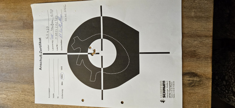 -Dieses und weitere Schussbilder mit RWS Evolution Green 6,0 gr bleifrei und Def.geschoss Brennecke, TOG, 9,0gr verbleit können auf Anforderung zugesandt werden. Die Schussbilder wurden am 02.02.2026 vom Büchsenmacher M. Korthals der Firma Waffen Schrum in Tellingstedt S-H erstellt.