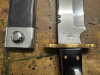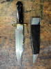 Angeboten wird ein neuwertiges Bowie Messer im Stil der Confederate States Army mit Lederscheide. Die Klinge ist leicht befeilt, die Scheide mit vernickeltem Blech beschlagen.