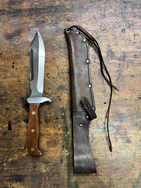 Angeboten wird ein Fahrten- oder Scout Messer aus Edelstahl mit Beilrücken und Lederscheide.
