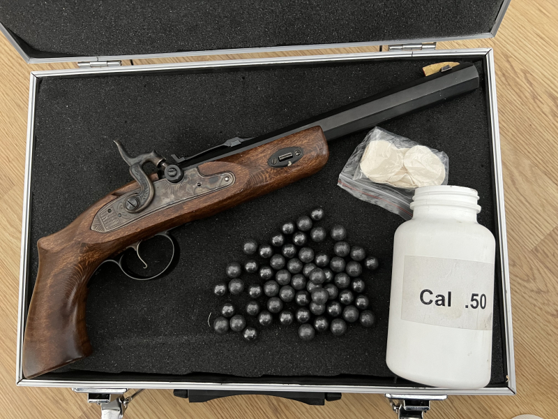 Verkauft wird eine Pistole mit Perkussionszündung im Kaliber .50 mit Ladestock, Schusspflastern und Geschossen. Gezählt habe ich 57 Geschosse. Vielleicht ist es aber auch eins mehr oder weniger.