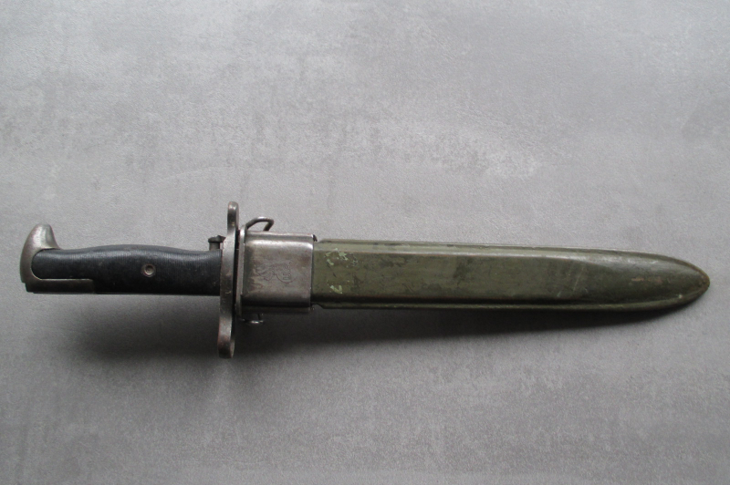 Biete hier aus Sammlungsauflösung ein schönes und originales US Bajonett für den Garand M1 aus dem 2. WK an. Es handelt sich um die gekürzte Version von 1943 der Firma P.A.L.. Zustand siehe Fotos.