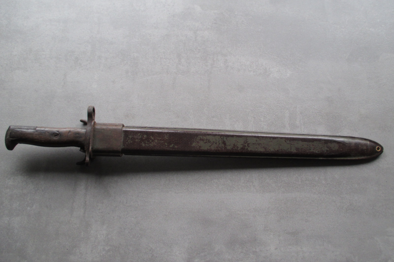 Biete hier aus Sammlungsauflösung ein schönes und originales US Bajonett für den Garand M1 aus dem 1. WK, vermutlich im 2. WK weiter verwendet, an. Es handelt sich um die seltene Lang-Version von 1908 der Firma S.A.. Es hat noch die Holzgriffschalen. Absolute Rarität. Zustand siehe Fotos.