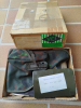 Ich biete hier als Sammlerwaffe eine späte Bundeswehr P1 der Fa. Walther/Ulm im Kaliber 9mm Parabellum an. Hergestellt im Oktober 1983 (10/83), Waffennummer etwas über 450.000. Also die qualitativ beste Bundeswehr Ausführung mit verstärktem Schlitten und der Hartmetall Verstärkung im Griffstück Das Besondere an dieser Waffe ist, neben dem Zustand und dem Zubehör, die unberührte Bundeswehr Verpackung mit VCI Konservierung. Ich habe mich über 20 Jahre beherrschen können und diese nicht geöffnet. Die Bundeswehr hat möglicherweise auch frisch revisionierte, also geprüfte, ggf. instandgesetzte und somit einwandfreie Waffen so konserviert und eingelagert. Die Verpackung lässt auch nur einen eingeschränkten Blick auf die Waffe zu. Aber was ich da erkennen kann, das läßt mich vermuten, dass diese Waffe nie ausgegeben wurde. Dafür spricht meines Erachtens auch der Umstand, dass der Waffe noch die originale, zur Waffe nummerngleiche Anschußscheibe beigefügt ist (gezeichnet von dem bekannten Walther Mitarbeiter Herrn Bär). Das habe ich so noch bei keiner anderen Bundeswehr P.38 / P1 gesehen. Der Pappkarton hat übrigens eine niedrigere, abweichende Nummer. Hierauf hatte der Händler seinerzeit beim Weiterverkauf wohl nicht geachtet. Dies ist ein Angebot nur für Waffenhändler, Waffensachverständige und Waffensammler mit entsprechender Berechtigung. Das alles ist meine unverbindliche Wahrnehmung. Aber beurteilen Sie dies alles so gut es geht anhand der Bilder. Bei ernsthaftem Interesse fordern Sie gerne weitere Informationen oder Detailfotos an. Interessenten aus dem Ausland müssen die Ausfuhr der Waffe selber organisieren. Ich liefere erst nach vollständiger Bezahlung an einen vom Käufer bestimmten, lizenzierten Waffenhändler hier in Deutschland, der meine Waffe dann im Auftrag des Käufers in sein Waffenhandelsbuch übernimmt. Alles weitere ist Angelegenheit des Käufers und des von ihm beauftragten Waffenhändlers. Bei Unklarheiten bitte vor dem Bieten fragen! Dies ist ein Privatverkauf, und der Käufer erklärt mit seinem Gebot ausdrücklich den Verzicht auf Gewährleistung, Umtausch, Rücknahme, Rücktritt und dergleichen!!! Das Versandrisiko trägt alleine der Käufer. Ich versichere aber eine hervorragende Verpackung, und ich beauftrage ein absolut zuverlässiges Unternehmen mit dem Versand. Und bitte stören Sie sich nicht an meinen letzten beiden Bewertungen. Diese habe ich als Käufer von zwei Händlern bekommen, die sich nicht korrekt verhalten haben. Das hat mir für längere Zeit den Spaß an egun verdorben. Aber wie Sie meinen weiteren Bewertungen entnehmen können, hat sich noch nie ein Käufer über mich als Verkäufer beklagt.