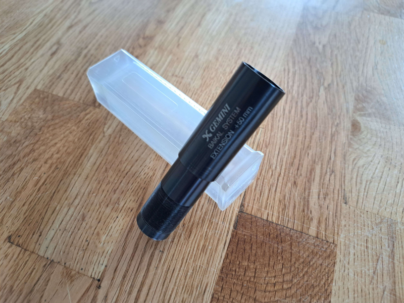 Es wird einfach der vorhandene Wechselchoke der Flinte herausgeschraubt und die Laufverlängerung in den Lauf hineingeschraubt. Der Baikal Wechselchoke kann dann in die Laufverlängerung wieder eingeschraubt werden. Somit wird die Lauflänge um 50mm verlängert. Hersteller ist der italienische TOP-Hersteller Gemini, der auf Chokes spezialisiert ist. Sehr hochwertige Fertigung. Die Laufverlängerung ist neuwertig. Verkauft wird NUR die abgebildete Laufverlängerung! Wechselchokes sind nicht dabei. Es wären aber noch welche auf Anfrage da, falls Interesse besteht.