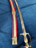 Die Scheide ist mit rotem Samt überzogen, auf der Vorderseite Glitzergewebe. Beschläge aus Messingblech.