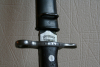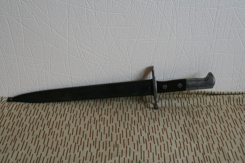 Das Bajonett ist vermutlich ein M1918. Kein Rost oder sonstigen Beschädigungen, auf der Klinge und in der Scheide alles in Fett. Hersteller ist Waffenfabrik Neuhausen, der Drücker funktioniert. Das Bajonett hat eine Seriennummer, die Scheide nicht, nur ein eingestempeltes Symbol unter dem Koppelhaken.