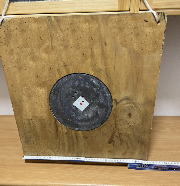 Die Scheibe hat 20 cm Durchmesser. Sie diente zum Einschießen einer Matcharmbrust.