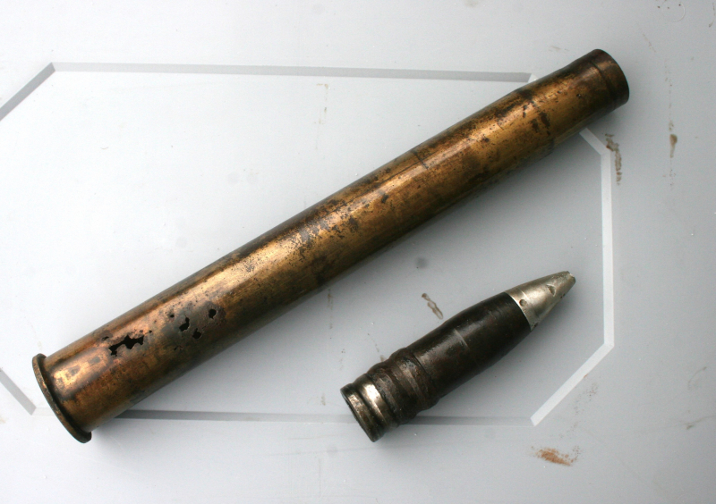Ein Loch im oberen Bereich und einige im unteren Bereich. Für einen Bodenfund gar nicht so übel. Die Stempelung am Boden der Hülse ist noch Lesbar.