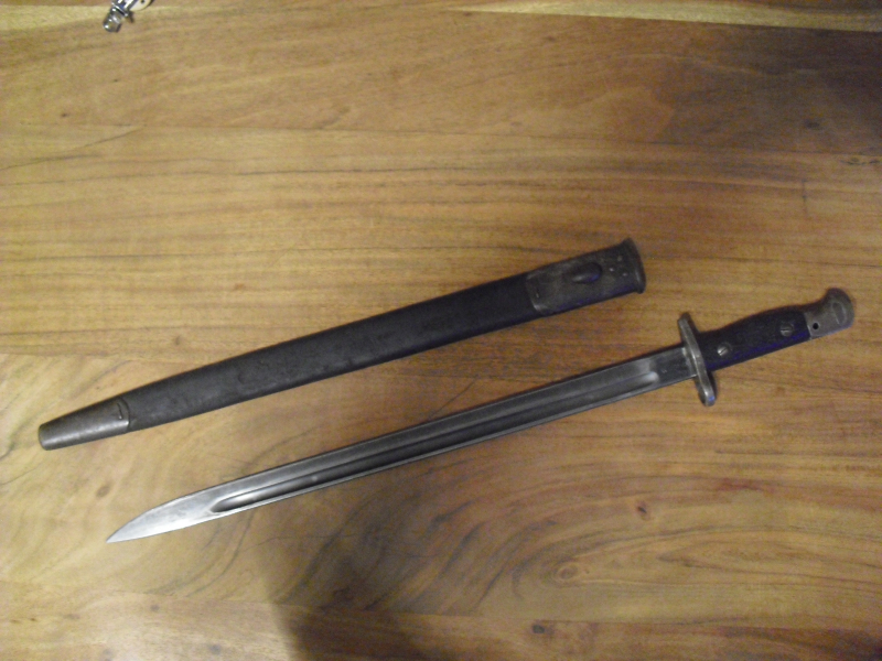 Hallo da ich meine Blankwaffensammlung auflösen möchte verkaufe ich hier einige Bajonette und Dolche. So auch dieses Lee-Enfield Bajonett 1907. Das Produktionsjahr ist meines Wissens August 1915, was an der Bestempelung zu erkennen ist. Der Hersteller ist Sanderson.