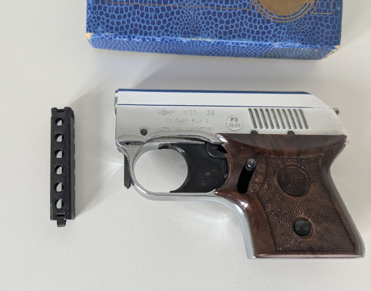 Der RG 3s ist ein absoluter Klassiker und wird seit den 50er Jahren nahezu unverändert produziert. Die verchromte Oberfläche und ihre Kompaktheit verleihen der Pistole ein markantes, unverwechselbares Aussehen. Das 6-schüssige Stangenmagazin transportiert die Patronen nach jedem Schuss mechanisch weiter, wobei die leeren Hülsen mittels einem (an der Pistole integrierten) Entladedorn aus dem Magazin ausgestoßen werden müssen.