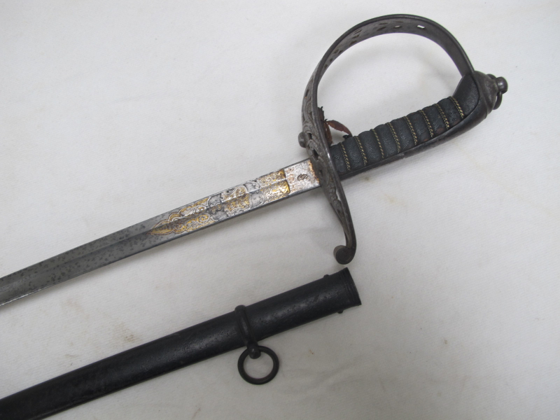 Auf dem Gefäß Württemberger Wappen. Händlersignatur auf dem Klingenrücken „H. Fishler Ludwigsburg“. Klinge mit Ritterkopf von Weyerberg als Hersteller und geätztem vergoldeten Württemberger Wappen. Gesamtlänge ohne Scheide 88 cm, Klingenlänge 74 cm, Klingenbreite 2,0 cm. Alles zusammengehörig und in gutem Zustand für dieses seltene Modell, siehe Fotos. Privatverkauf.