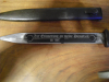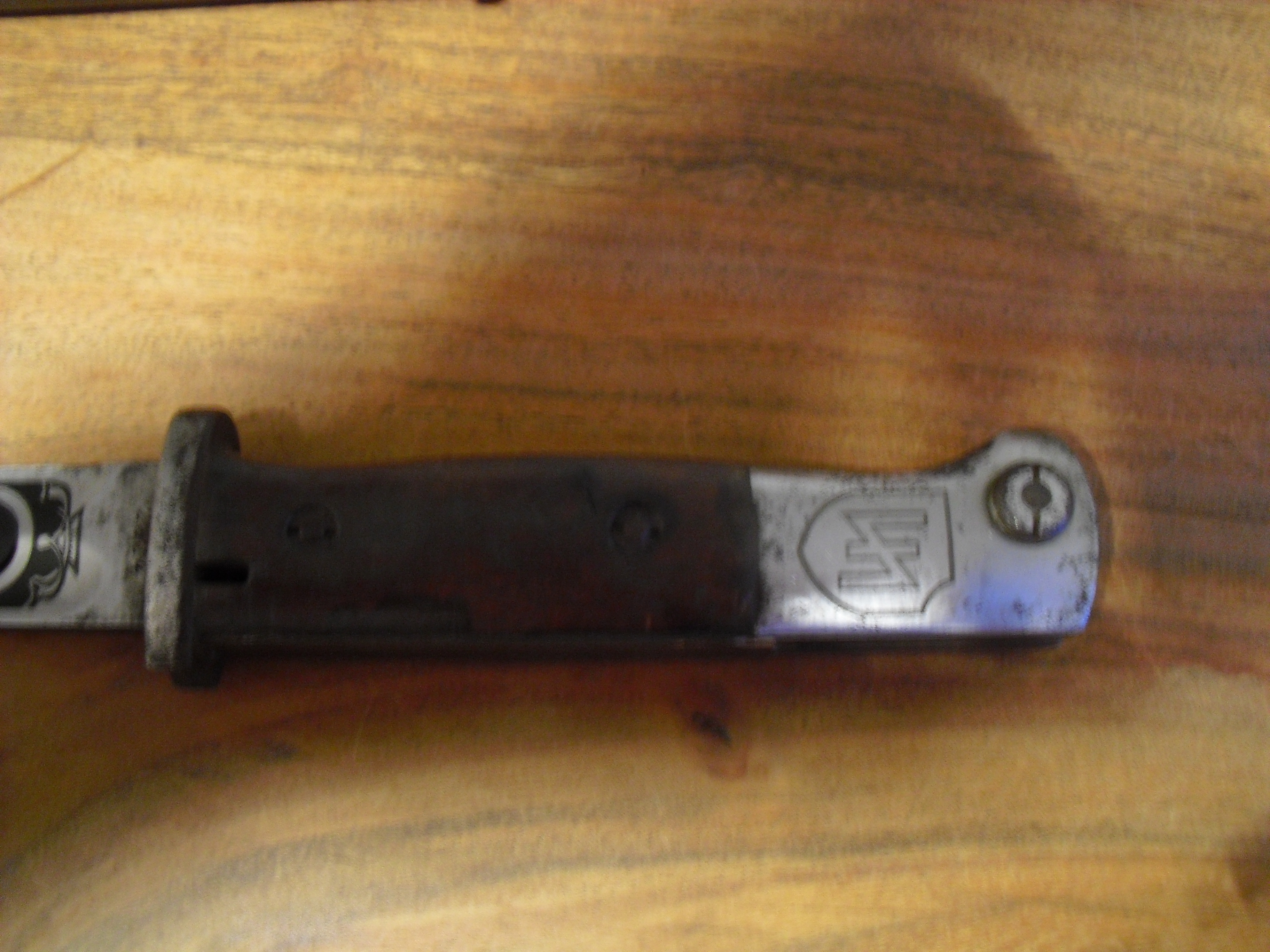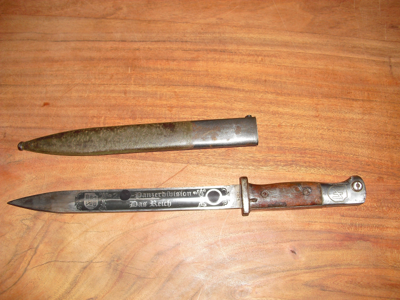 Das Bajonett trägt auf der Klinge beidseitig eine Ätzung. Auf der einen Seite steht: "ZUR ERINNERUNG AN DEINE DIENSTE IN DER SS" und auf der anderen Seite: "2. SS PANZERDIVISION DAS REICH". Oben auf dem Griff ist das Zeichen der Panzerdivission zu erkennen. Der Hersteller des Bajonetts ist Elite Diamant auf der äußeren Kante ist die Zahl 38 zu erkennen. Der Drücker ist gängig und die Feder schiebt ihn zurück. Die Ätzung macht einen sehr guten Eindruck und kann ggf. auch nachträglich gemacht worden sein. Hierfür ist mein Fachwissen nicht groß genug. Die Scheide ist mit COF 43 gestempelt (Waffenfabrik Carl Eickhorn, Solingen) und stellenweise Rostnarbig. Für die Bilder wurden die Runen abgeklebt. Das Bajonett sitzt fest in der Scheide. Bei Fragen bitte melden!
