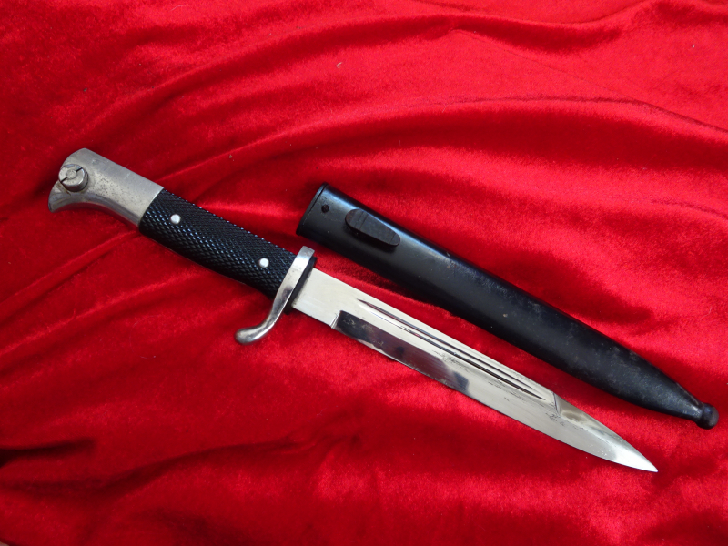 Sie bieten hier auf ein Ausgehbajonett in kurzer Ausführung mit dem eher selteneren Hersteller Klaas Solingen, kplt. mit dazugehöriger Scheide, diese mit original Lack, insgesamt noch sehr guter Zustand, Drücker gängig, Klinge nicht geschliffen und keine Scharten, garantiert alt und original, darauf gewähre ich uneingeschränktes Rückgaberecht, ebenso bei falscher Beschreibung, ansonsten da Privatverkauf keine Gewährsübernahme!