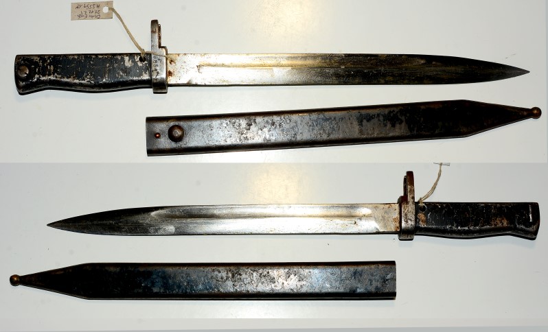 Deutsches Ersatzbajonett 1. Weltkrieg, Waffennummer und Klingenrücken mit Abnahmestempel , originale schwarze Lackierung zum großen Teil abgestoßen, Klingenlänge 31,3 cm, Behelfsscheide (praktisch ein platt gedrücktes Rohr), ansonsten guter Zustand
