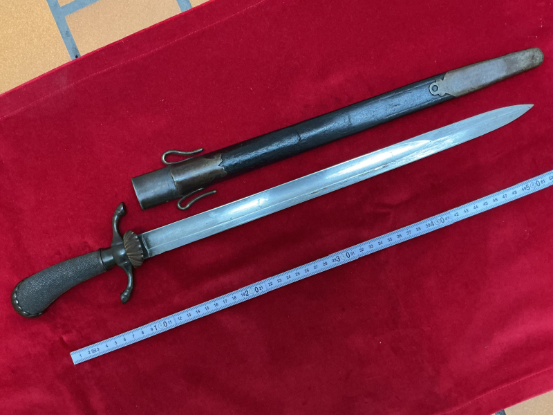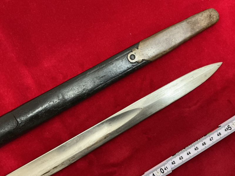 Aus Nachlass….Hirschfänger, wohl süddeutsch. Komplette Eisenmontierung. Zugehörige, passende Lederscheide. Diese gut erhalten, Gebrauchsspuren. Griff mit Rochenhaut. Beimesser fehlt, Klinge gut, minimale Anlaufspuren. Keine Rostnarben. Sehr schönes Stück.