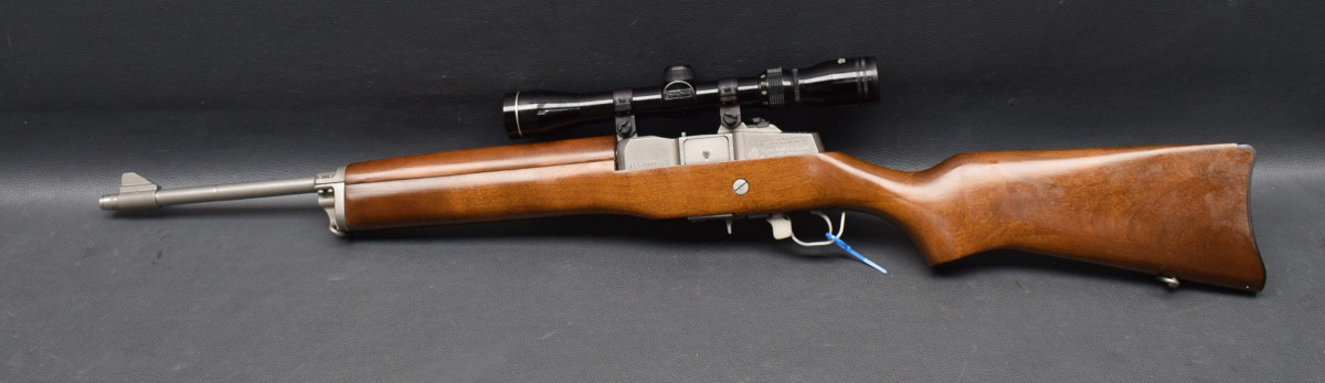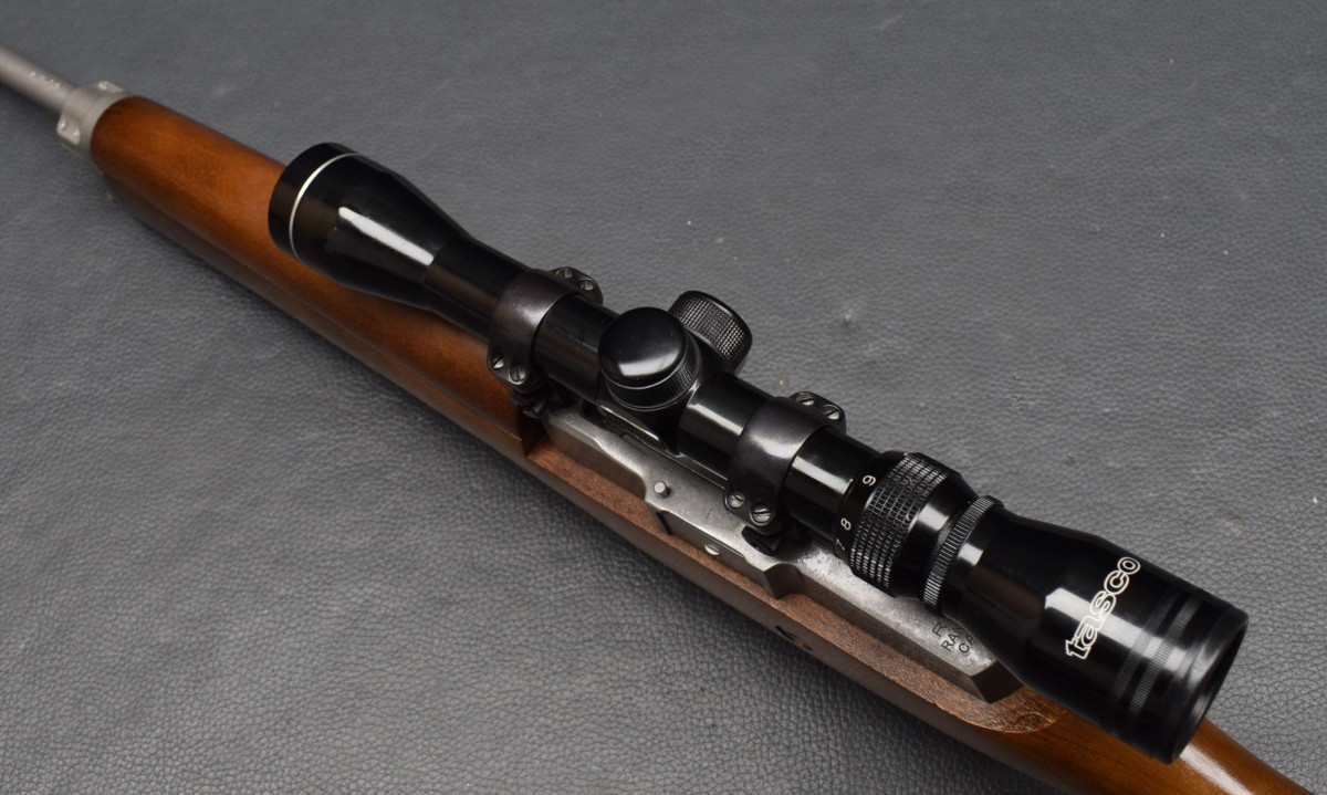 Druckpunktabzug, Sicherung am Abzugsbügel, herausnehmbares 5-Schuss Magazin. Montiert mit Zielfernrohr Tasco 3-9x40 Abs.Plexy, mittels Ruger Aufkippmontage mit 25,4mm Ringen.