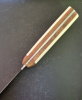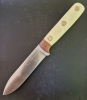 Tolles Jagd- und Brotzeitmesser - Eigenfertigung - in ausgezeichnetem Zustand nach Herstellung. "Condorklinge", Custom Kephart Blank Blade,1075 HCS, COCB247-45 HC, nicht rostfrei, 11,5 cm lang. Griffmaterial Knochen unterlegt mit Nußbaunholz, goldfarbene Nieten und Zierpin. Dazu exakt angepaßt eine Lederscheide mit sogen. "Ploppsicherung". Das Messer sitzt sicher und fest und ist dennoch sofort einsatzbereit.
