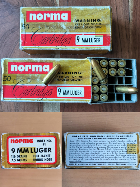 Es handelt sich dabei um eine volle und eine angefangenes Schachtel Norma Cartridges im Kaliber 9mm Luger (9mm x 19).