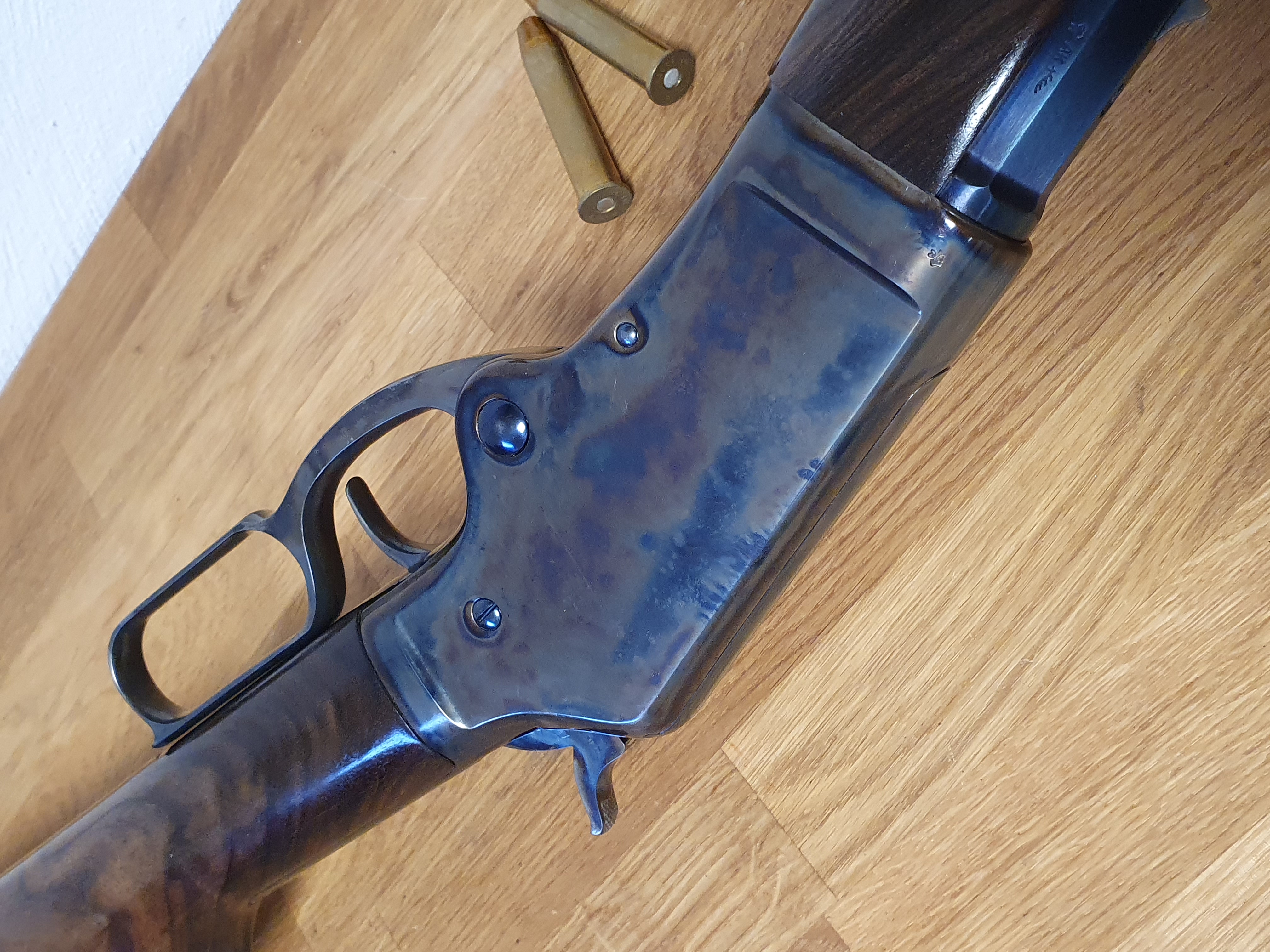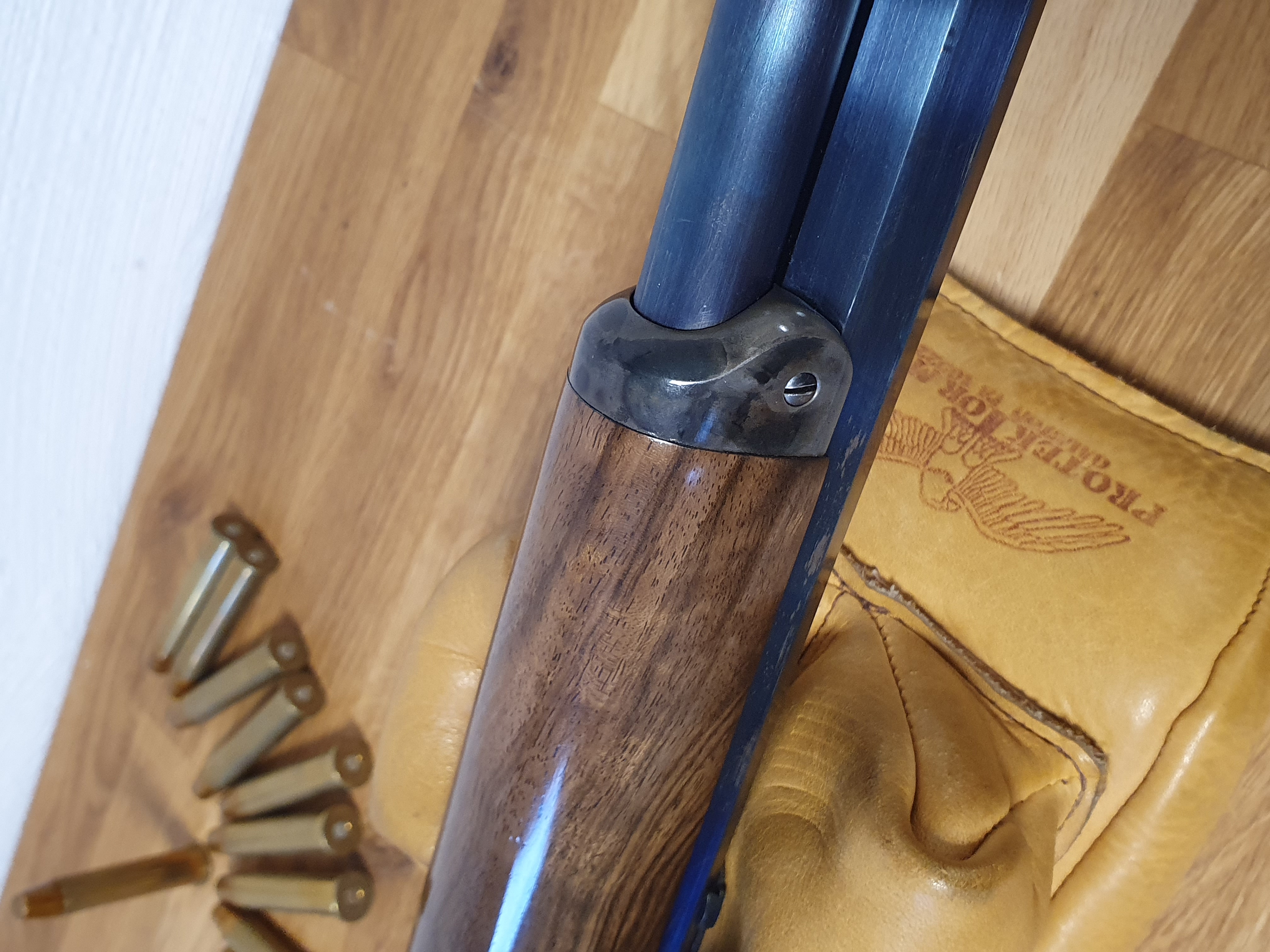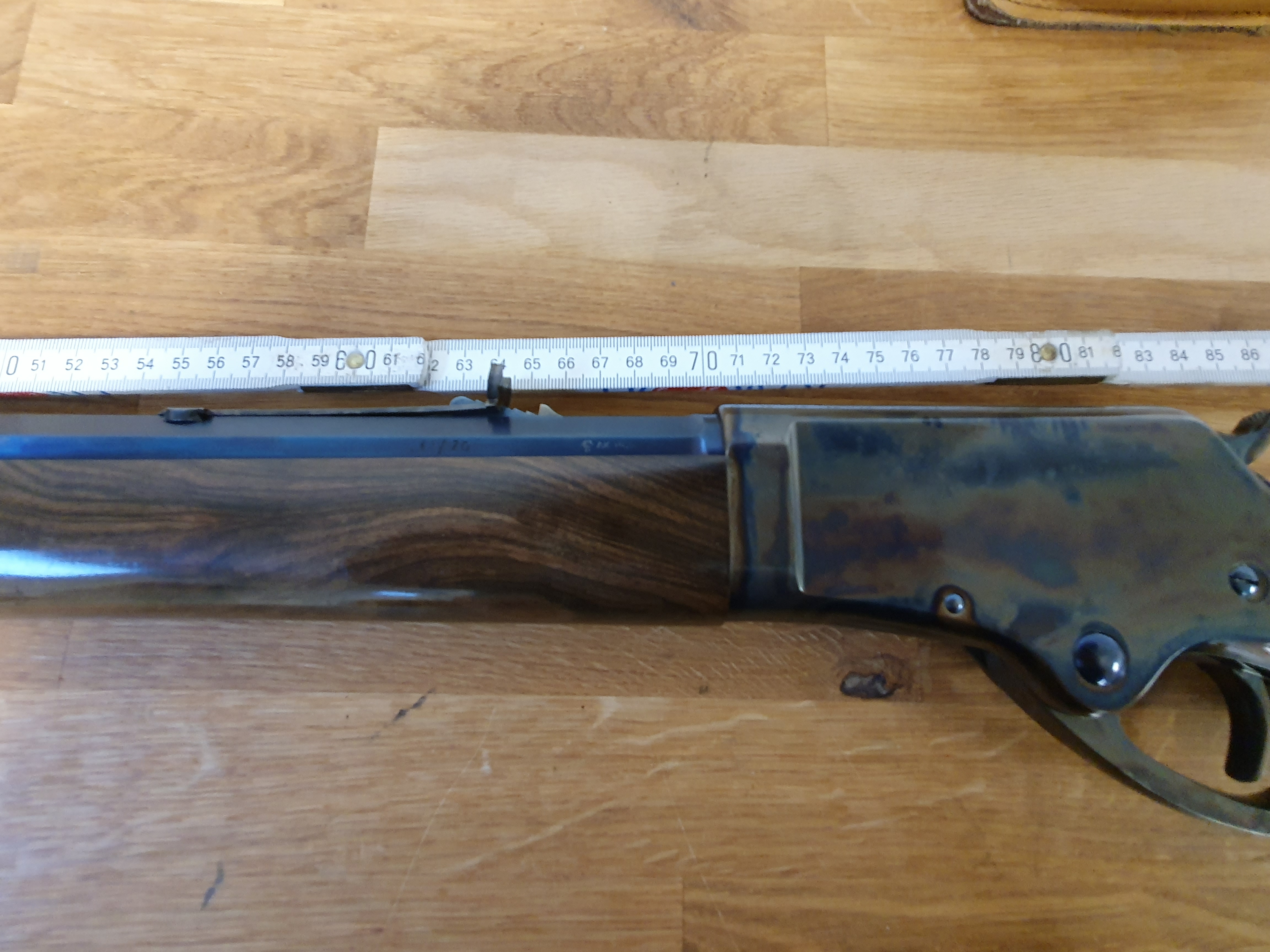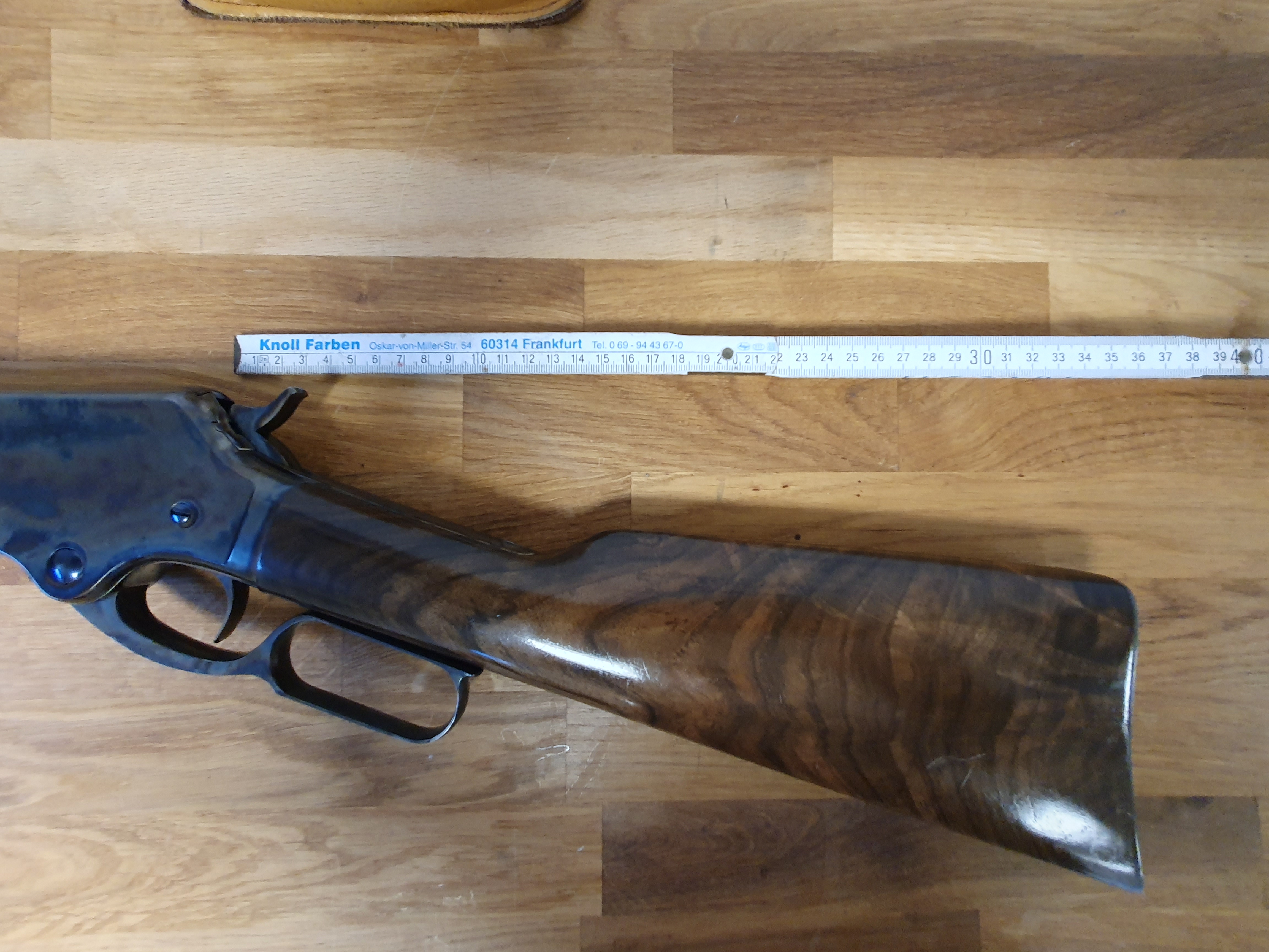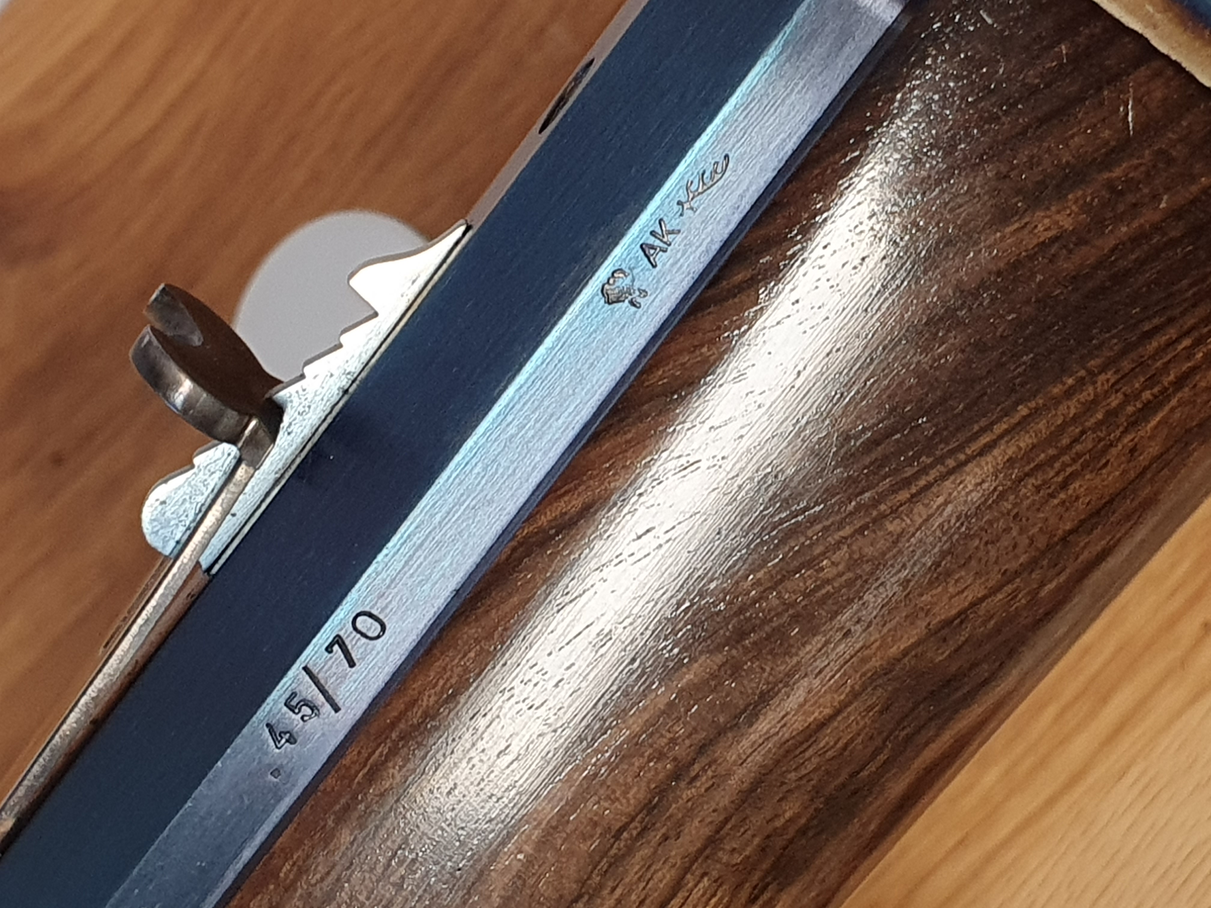 Die Büchse ist von höchster Qualität, auf dem Lauf ist der Firmenstempel des Büchsenmacher KREBS, vermutlich nicht ohne Grund. Der trockenstehende, Matchabzug, der ohne Vorzug auslöst, sucht seines gleichen. Das System läuft sauber und spielfrei. Lauf und System sind gebläut, LL 28“ Achtkant-Matchlauf, sauber, spiegelblank, die Züge sind scharf, (der Lauf ist vermutlich von KREBS getauscht?). Gewicht ca.5,2kg. GL: ca.118 cm. Kapazität 9+1 Patronen. In dem Nachlass zu dieser Waffe waren nur selbstgeladene Patronen mit Bleigeschossen in dem Kaliber .45-70 Govt. Visierung / Buckhorn Kimme, ausgesuchtes Schaftholz mit kleinen Kratzern, minimale Macken an dem Röhrenmagazin. Weiterhin sind noch ca. 80 Handgeladene Patronen, ca.100-120 Hülsen und ca. 300 Bleigeschosse sowie ein RCBS-Matrizensatz vorhanden (nicht Bestandteil dieser Auktion).