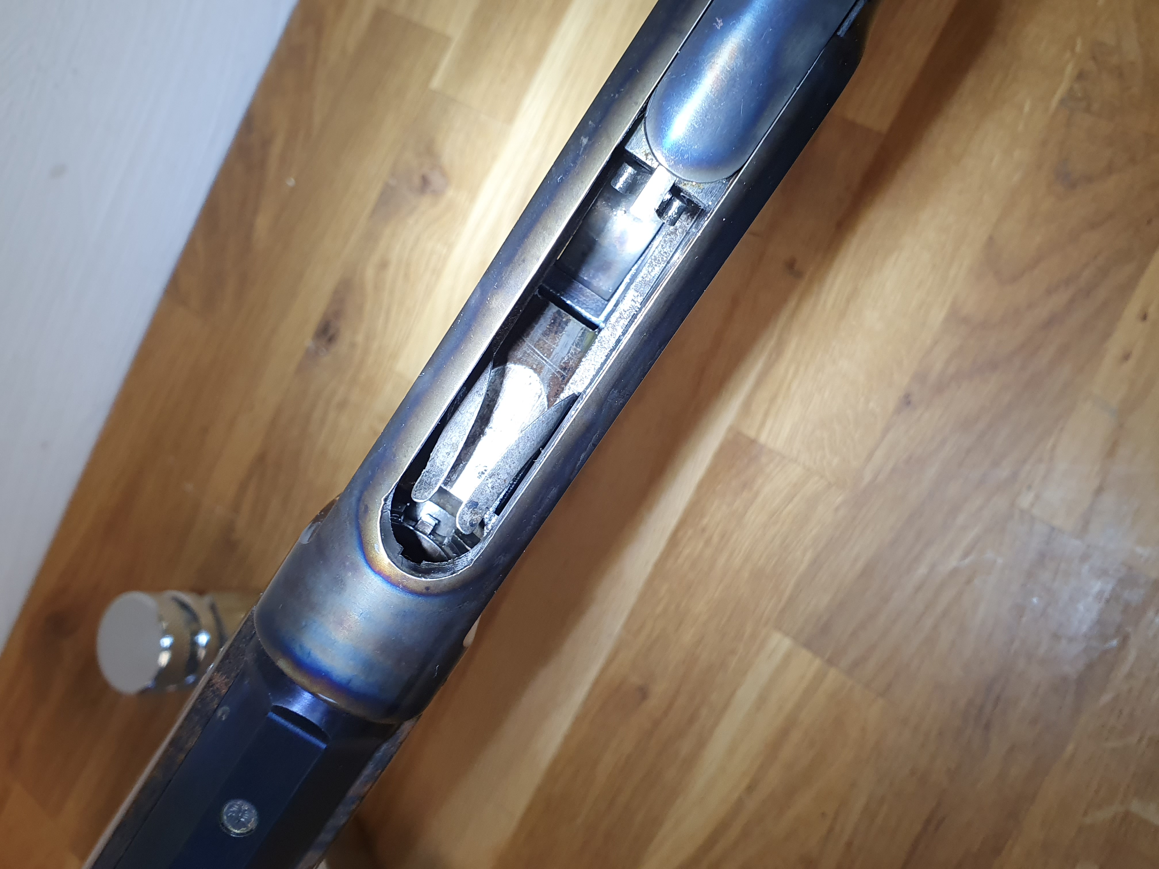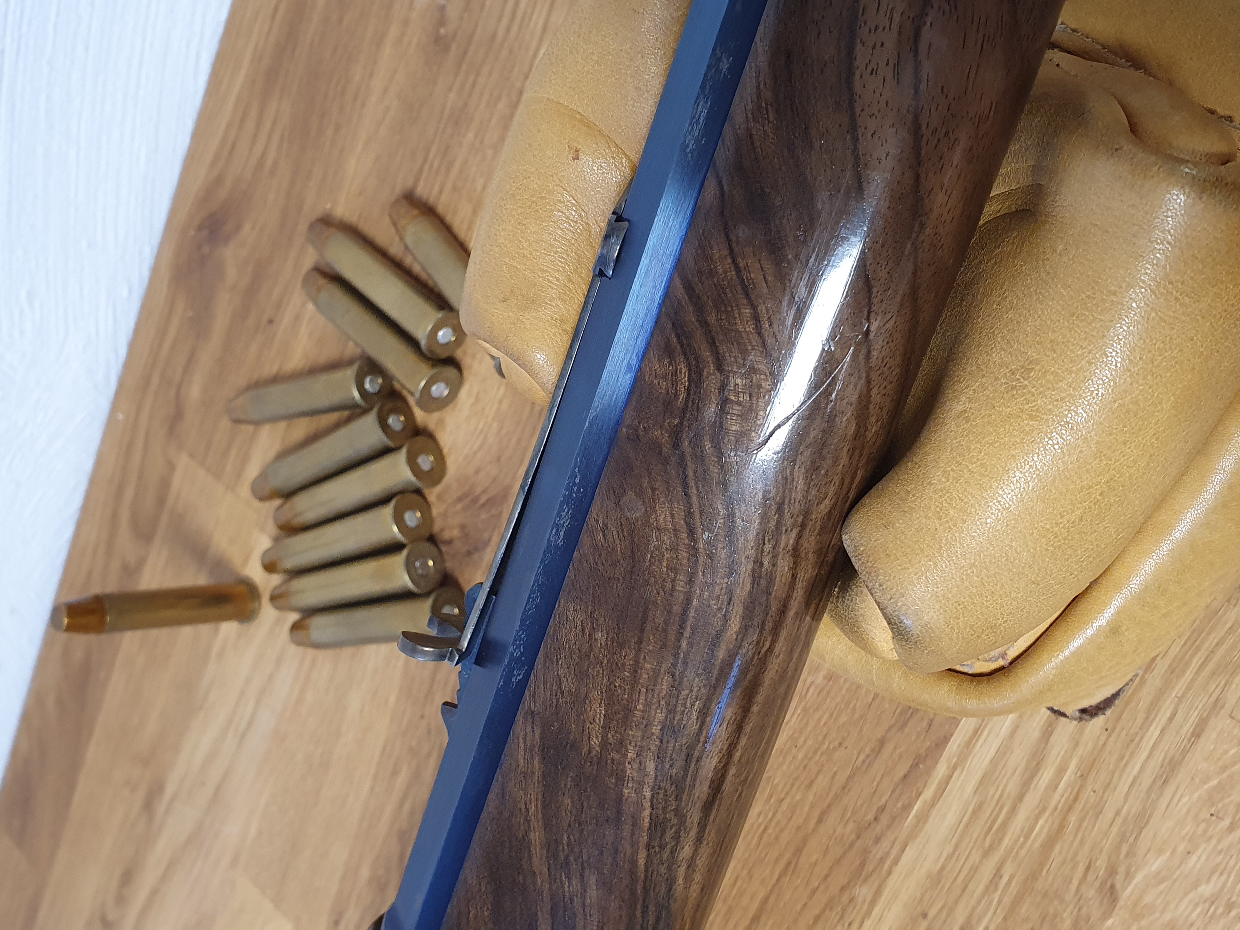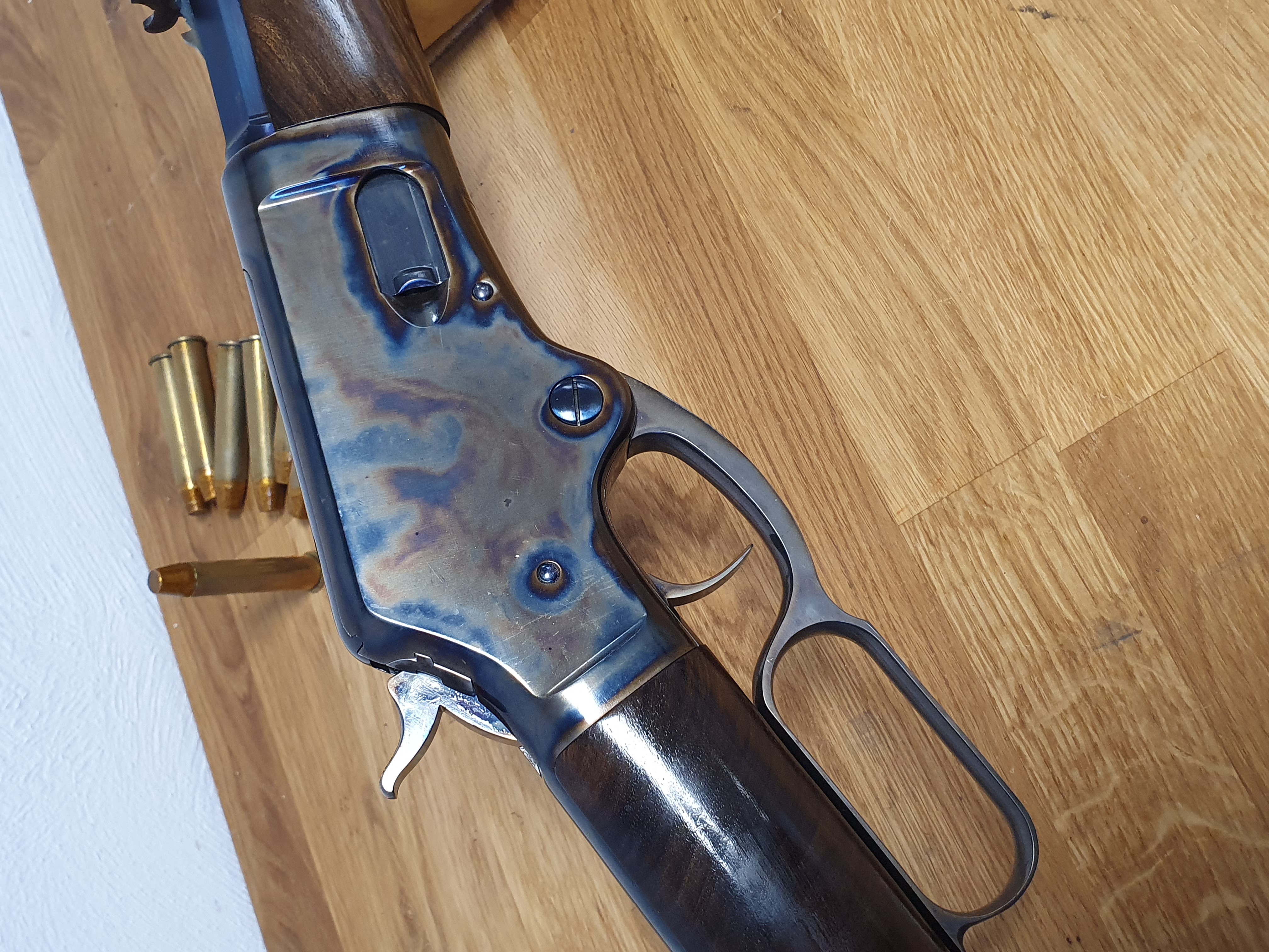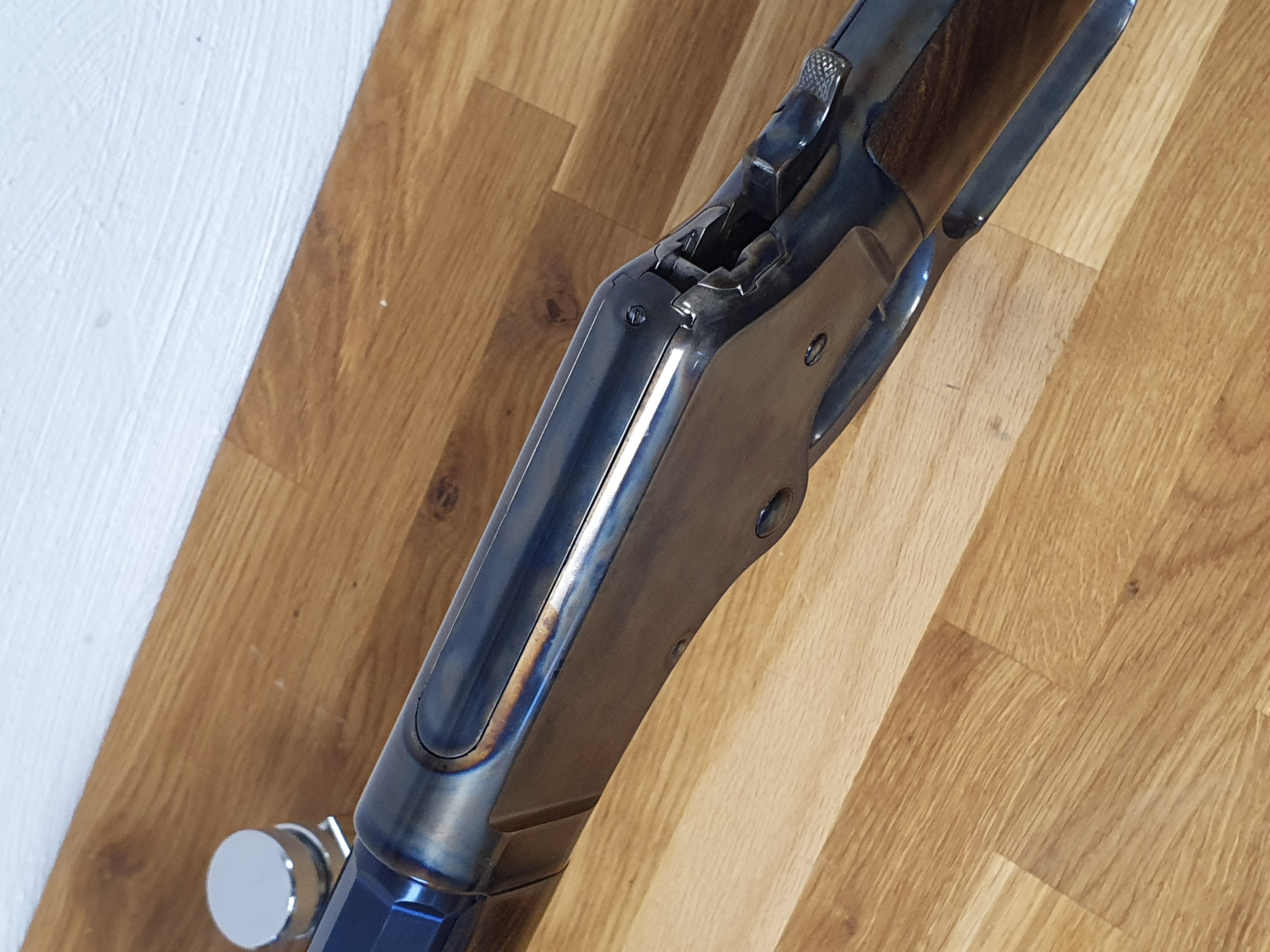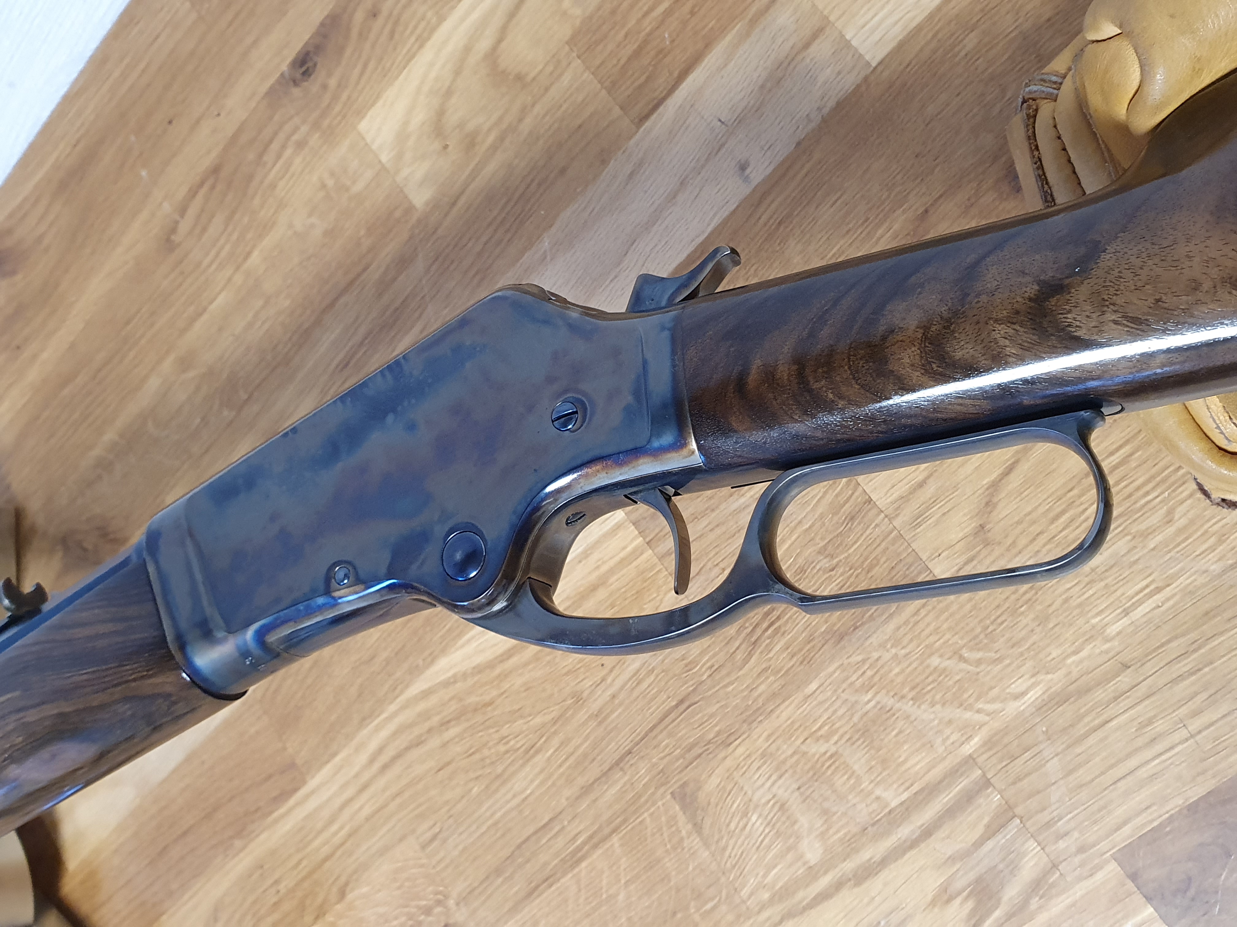 Die Büchse ist von höchster Qualität, auf dem Lauf ist der Firmenstempel des Büchsenmacher KREBS, vermutlich nicht ohne Grund. Der trockenstehende, Matchabzug, der ohne Vorzug auslöst, sucht seines gleichen. Das System läuft sauber und spielfrei. Lauf und System sind gebläut, LL 28“ Achtkant-Matchlauf, sauber, spiegelblank, die Züge sind scharf, (der Lauf ist vermutlich von KREBS getauscht?). Gewicht ca.5,2kg. GL: ca.118 cm. Kapazität 9+1 Patronen. In dem Nachlass zu dieser Waffe waren nur selbstgeladene Patronen mit Bleigeschossen in dem Kaliber .45-70 Govt. Visierung / Buckhorn Kimme, ausgesuchtes Schaftholz mit kleinen Kratzern, minimale Macken an dem Röhrenmagazin. Weiterhin sind noch ca. 80 Handgeladene Patronen, ca.100-120 Hülsen und ca. 300 Bleigeschosse sowie ein RCBS-Matrizensatz vorhanden (nicht Bestandteil dieser Auktion).