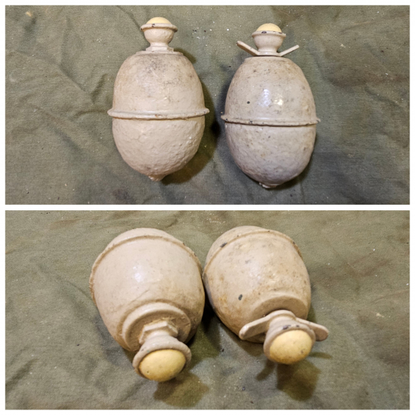 2x deutsche Ei Handgranaten..dienten als Füllung fürs Tragegestell..Eier sind mit Beton oder Harz ausgegossen...alles inert und deko