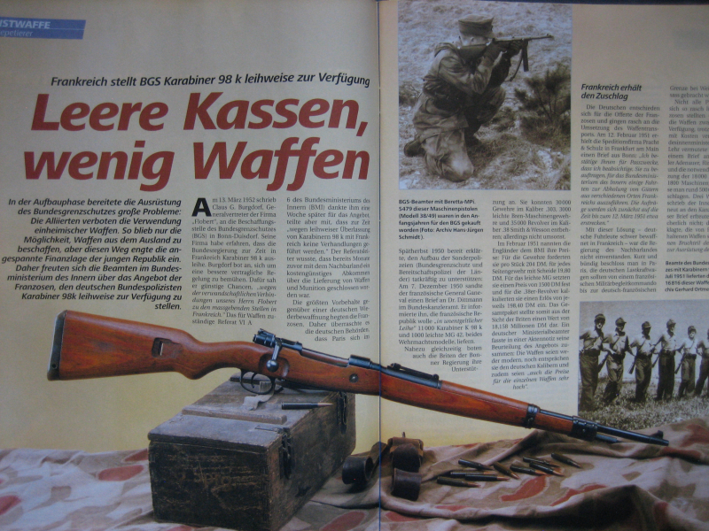 Für Historiker, Waffenfreunde und -Ordonnanz-/Gewehrschützen +++ angeboten wird ein DWJ-Heft mit einem interessanten Beitrag für Gewehrschützen -- ** Karabiner 98 für den BGS ** ++ In der Aufbauphase bereitete die Ausrüstung des BGS gro0e Probleme. Über das Angebot der Franzosen Karabiner 98k leihweise zur Verfügung zu stellen freute sich das Bundesministerium. ++ Weitere Einzelheiten können Sie in dem Bericht (6 Seiten) nachlesen; ein Bericht, der sicher nicht nur für Gewehrschützen von Interesse ist. +++ und es gibt noch weitere interessante Berichte z.B. für Sammler/Schützen (5 Seiten)- ** Sturmgewehr 44 ** +++ Das Heft ist gebraucht, befindet sich aber in einem sehr guten Zustand +++ Der Versand erfolgt als Großbrief mit DHL (unversichert) ; die Versandkosten gelten nur für Deutschland.+++ Bieter aus dem Ausland bitte Versandkosten vor Gebot erfragen.+++ Versandrabatt möglich, sehen Sie auch meine anderen Angebote.+++ Privatverkauf, daher keine Gewährleistung, Garantie oder Rücknahme. 9-2004 +++ Fragen bitte mailen.