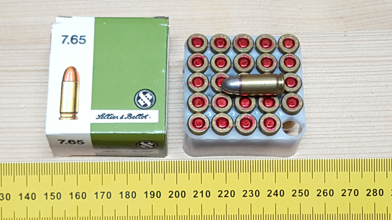 Sammlermunition: 25 Dekopatronen 7,65 Brng. S&B in Schachtel.
