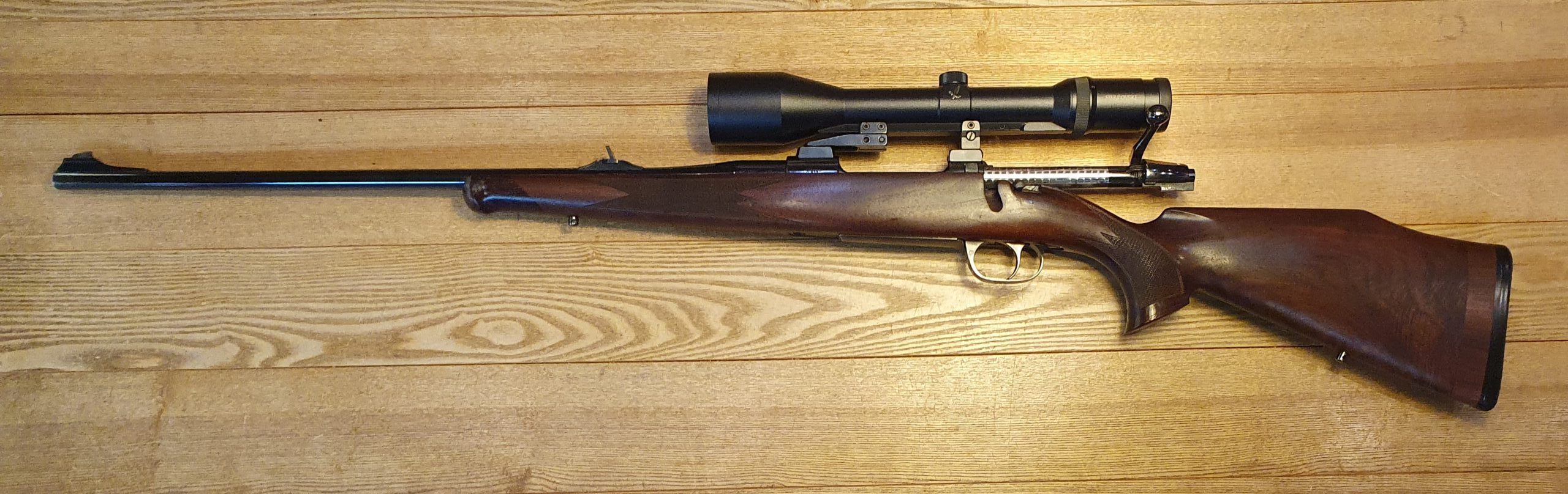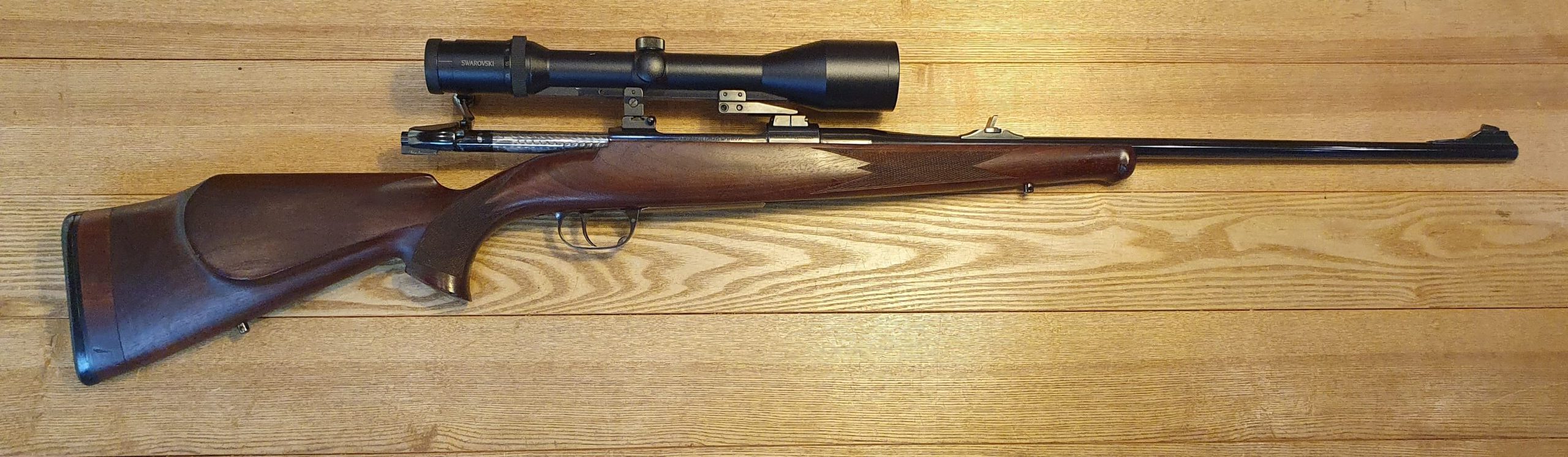Cal. 30-06 Spr mit Rückstecher Gute Schußleistung (4cm / 100m), Beschuss 1994 Lauflänge 60cm, Schaftlänge 38cm (Schaft wurde einmal fachmännisch verlängert) Schwenkmontage mit Swarovski Habicht 3-9×50, Absehen 4 (1.Bildebene)