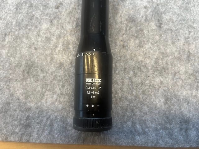 Voll funktionsfähiges Zeiss Diavari-Z 1,5-6x42 T* Absehen 4 ohne Leuchtabsehen mit Außen- Trapez- Prismen Schiene. Zoom und Absehenverstellung funktionieren problemlos. Vorallem an der Schiene hat das ZF Kratzer/Farbabplatzungen. Am Tubus weniger Gebrauchsspuren. Linsen/Bild klar und ohne Eintrübungen o.ä. Ideal für Drückjagden oder Pirsch. Die Schiene hat Bohrungen von der vorherigen Montage Einhakmontage. ZF war viele Jahre auf meiner Kipplaufbüchse montiert, mußte jetzt einem größeren ZF weichen.