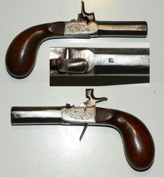 Perkussionsterzerol, Lauflänge 6,0 cm, Gesamtlänge 17,3 cm, Kaliber 11,7 mm, Metall mit Spuren alten Flugrosts, die Funktion ist gut, der Hahnform nach aus Frankreich, kein Beschussstempel, auf dem Lauf die Marke "M"