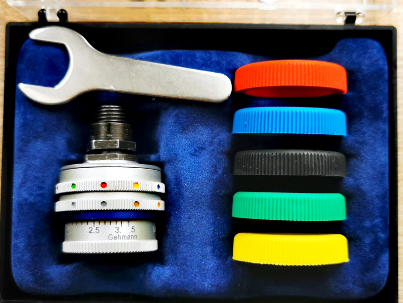 mit fünf verschiedenfarbigen Aufsteckkappen (unbenutzt) für die Augenmuschel zum leichteren Fokussieren
