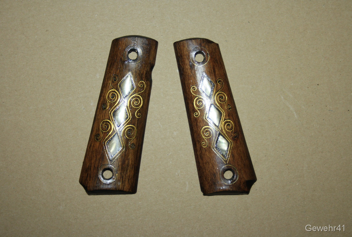 Sie bieten auf diese besonderen 1911er Griffschalen aus Holz mit Perlmutt-Einlagen.